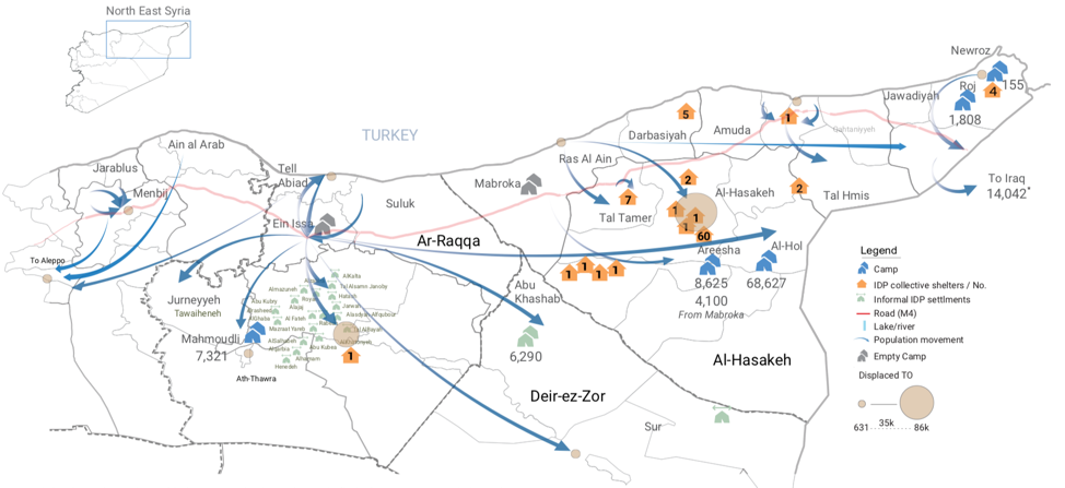 Despite various ceasefires, fighting continues in some pockets of the northeast. However, these hostilities have not yet triggered a new round of displacement. Indeed, IDP flows have begun to stabilize over the last few weeks. This is good news, as many of the areas currently providing sanctuary are struggling to keep up with the new arrivals. They would be hard pressed to accommodate additional IDPs. This is particularly true in Hasakah, where local leaders report that the city cannot absorb additional IDPs.